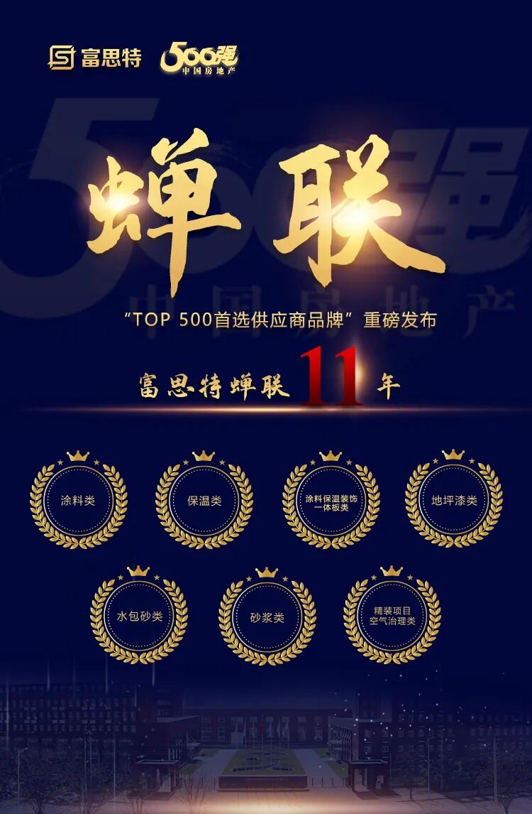 富思特获2021中国房地产开发企业综合实力TOP500涂料类、保温材料类、涂料保温装饰一体板类、地坪类、水包砂类、砂浆类、精装项目空气治理产品类首选供应商品牌7项荣誉。